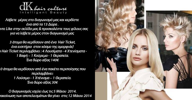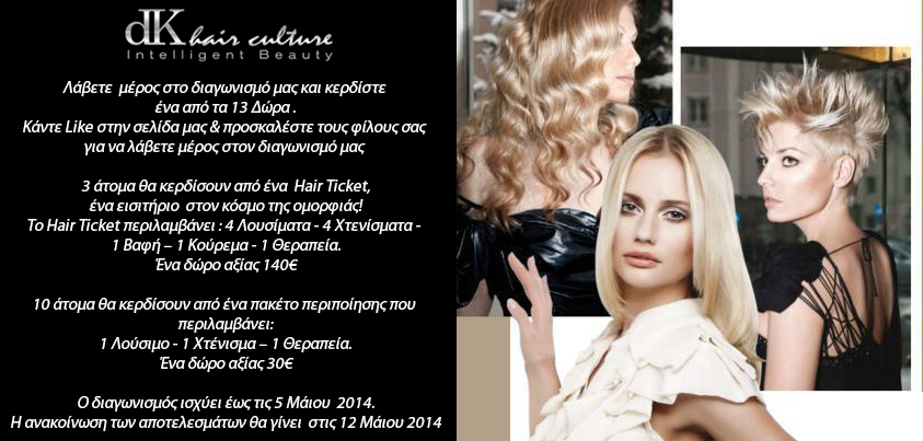 Το dkhairculture.com διοργανώνει διαγωνισμό και δίνει τη δυνατότητα σε 3 άτομα να κερδίσουν από ένα Hair Ticket & σε 10 άτομα να κερδίσουν από ένα πακέτο περιποίησης!
