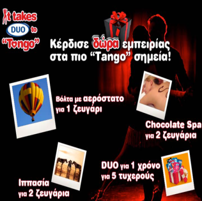 Η σελίδα DUO Greece διοργανώνει διαγωνισμό και σας δίνει τη δυνατότητα να κερδίσετε HOT δώρα εμπειρίας: Βόλτα με αερόστατο για 1 ζευγάρι, ιππασία για 2 ζευγάρια, Chocolate Spa για 2 ζευγάρια και προφυλακτικά DUO για 1 χρόνο.