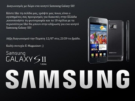 Το E- Magazine διοργανώνει διαγωνισμό και σας δίνει τη δυνατότητα να κερδίσετε ένα κινητό Samsung Galaxy SII αξίας 499 ευρώ.