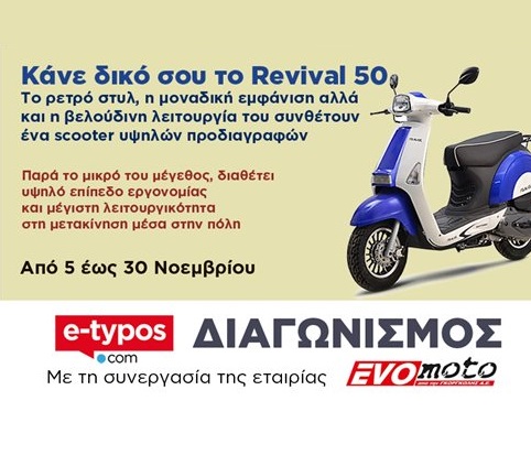 H εφημερίδα e-typos.com διοργανώνει διαγωνισμό και σας δίνει τη δυνατότητα να κερδίσετε ένα scooter Revival 50!