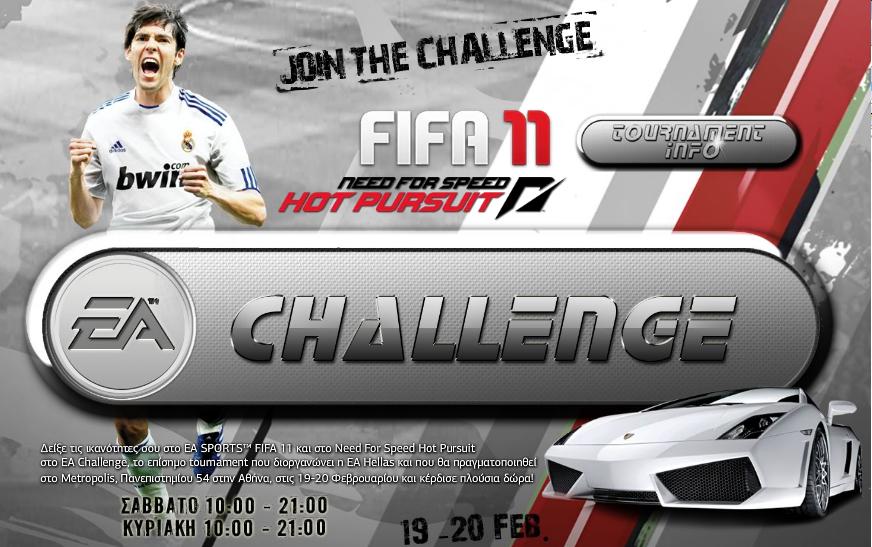 Δείξε τις ικανότητες σου στο EA SPORTS FIFA 11 και στο Need For Speed Hot Pursuit στο EA Challenge, το επίσημο tournament που διοργανώνει η EA Hellas και που θα πραγματοποιηθεί στο Metropolis, Πανεπιστημίου 54 στην Αθήνα, στις 19 – 20 Φεβρουαρίου και κέρδισε πλούσια δώρα!