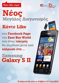 Το Easy Buy World διοργανώνει διαγωνισμό και σας δίνει τη δυνατότητα να κερδίσετε ένα Samsung Galaxy S II, με οθόνη 4.3″, φωτογραφική μηχανή 8 MP και λειτουργικό Android αξίας 466.00€.