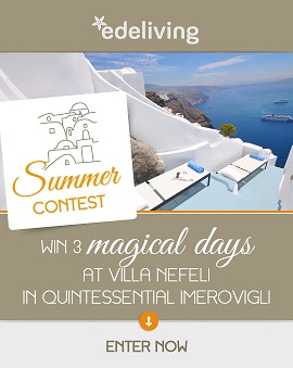 Επισκεφτείτε την ιστοσελίδα του Edeliving, κάντε Like στην σελίδα Facebook του Edeliving, συμπληρώστε τα προσωπικά σας στοιχεία μέχρι και τις 31 Αυγούστου και ζήστε την απόλυτη εμπειρία πολυτελών διακοπών στην γοητευτική βίλα Ναυσικά χτισμένη στους απόκρημνους βράχους στο Ημεροβίγλι. Αφεθείτε στη σαγηνευτική ατμόσφαιρα του ρομαντισμού και την πολυτέλεια μιας αξέχαστης διαμονής και απολαύστε την ανυπέρβλητη θέα στα σμαραγδένια νερά του Αιγαίου, την ανεπανάληπτη Καλντέρα και τον ιριδίζοντα ουρανό του δύοντος ηλίου του συναρπαστικού αυτού νησιού των Κυκλάδων.