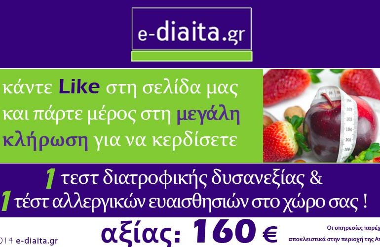 Το e-diaita.gr διοργανώνει διαγωνισμό και σας δίνει τη δυνατότητα να κερδίσετε ένα τεστ διατροφικής δυσανεξίας και ένα τεστ αλλεργικών ευαισθησιών στο χώρο σας!