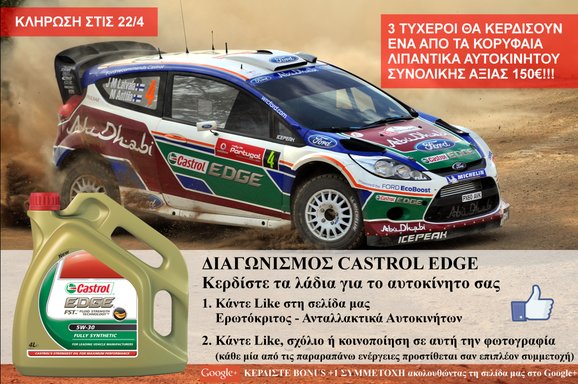 Tο κατάστημα “Ανταλλακτικών Αυτοκινήτου ΕΡΩΤΟΚΡΙΤΟΣ” θα κληρώσει 3 τυχερούς που θα κερδίσουν από ένα CASTROL Edge των 4 λίτρων συνολικής αξίας 150€, τα οποία αποτελούν την ανώτερη σειρά λιπαντικών αυτοκίνητου που προσφέρει η κορυφαία εταιρεία.