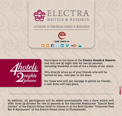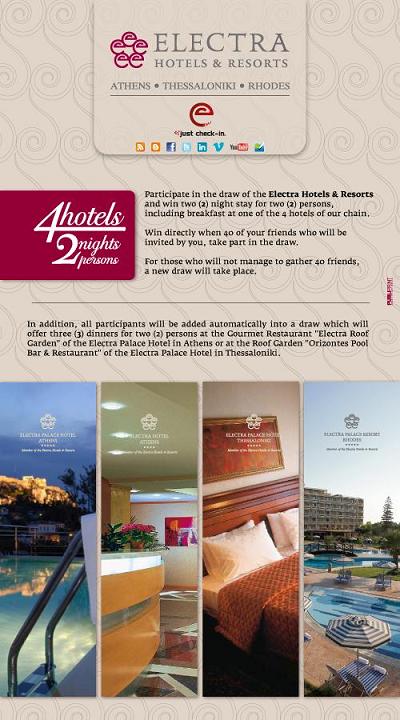 Το Electra Hotels & Resorts διοργανώνει διαγωνισμό και δίνει τη δυνατότητα σε 3 τυχερούς να κερδίσουν 2 διανυκτερεύσεις για 2 άτομα με πρωινό σε 1 από τα 4 ξενοδοχεία της αλυσίδας. Επιπλέον για όλες τις συμμετοχές θα κληρωθούν 3 δείπνα για 2 άτομα στο εστιατόριο “Electra Roof Garden” στο ξενοδοχείο “Electra Palace Athens” και στο εστιατόριο “Orizontes Pool Bar & Restaurant” στο ξενοδοχείο “Electra Palace Thessaloniki”.