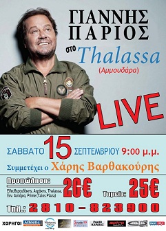 Η σελίδα του Ελευθερουδάκης – Etiquette Ηράκλειο διοργανώνει διαγωνισμό και σας δίνει τη δυνατότητα να κερδίσετε 5 εισιτήρια για το Live του Γιάννη Πάριου στο Thalassa στην Αμμουδάρα Ηρακλείου Κρήτης το Σάββατο 15 Σεπτεμβρίου (μαζί με τον Χάρη Βαρθακούρη).