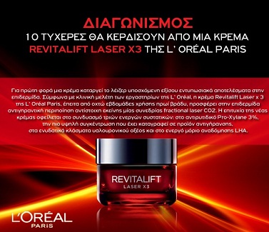 Το elle.gr διοργανώνει διαγωνισμό και σας δίνει τη δυνατότητα να κερδίσετε 10 κρέμες προσώπου REVITALIFT LASER X3 της LOREAL PARIS.