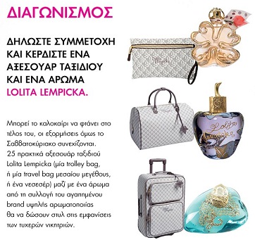 Το elle.gr διοργανώνει διαγωνισμό και σας δίνει τη δυνατότητα να κερδίσετε 25 αξεσουάρ ταξιδιού LOLITA LEMPICKA (10 trolley bags ή 5 μεσαίου μεγέθους travel bags ή 10 νεσεσέρ) μαζί με ένα άρωμα από τη συλλογή LOLITA LEMPICKA.