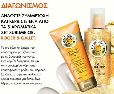 Το elle.gr διοργανώνει διαγωνισμό και σας δίνει τη δυνατότητα να κερδίσετε 5 αρωματικά σετ SUBLIME OR, ROGER & GALLET, το οποίο περιλαμβάνει ένα άρωμα Eau Sublime OR και μια κρέμα σώματος Crème Sublime Or.