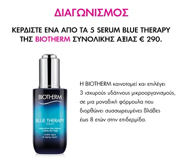 Το elle.gr διοργανώνει διαγωνισμό και σας δίνει τη δυνατότητα να κερδίσετε 5 SERUM BLUE THERAPY της BIOTHERM αξίας 58€ έκαστο.