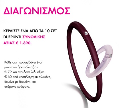 Το elle.gr διοργανώνει διαγωνισμό και σας δίνει τη δυνατότητα να κερδίσετε 10 σετ κοσμημάτων DuePunti της FA CAD’ORO. Κάθε σετ περιλαμβάνει ένα μοντέρνο βραχιόλι αξίας 79€ και ένα δαχτυλίδι αξίας € 60 από σιλικόνη, δεμένα με διαμάντι, σε διάφορα χρώματα.