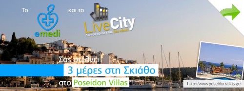 Το emedi.gr διοργανώνει διαγωνισμό και σας δίνει τη δυνατότητα να κερδίσετε διακοπές στην κοσμοπολίτικη Σκιάθο. Ένα τυχερό ζευγάρι, για ένα αξέχαστο τριήμερο στο τουριστικό κατάλυμα Poseidon Villas στην περιοχή του Αγ. Φανουρίου, μόλις 300μ από την οργανωμένη & βραβευμένη με γαλάζια σημαία αμμουδιά της Μεγάλης Άμμου.