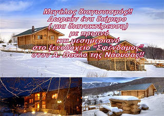 To blog της Νάουσας ΕΠΕΑ ΠΤΕΡΟΕΝΤΑ διοργανώνει διαγωνισμό και σας δίνει τη δυνατότητα να κερδίσετε ένα διήμερο απόλαυσης (μια διανυκτέρευση) στο μαγευτικό Βέρμιον, λίγα χιλιόμετρα μακριά από το χιονοδρομικό κέντρο των “3-5 Πηγαδιών”, στο ξενοδοχείο “Σφένδαμος” στην περιοχή του Α. Παύλου (Κουτσούφλιανη).