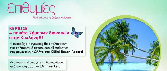 Οι epithimies.gr διοργανώνουν καλοκαιρινό διαγωνισμό και σας κάνουν δώρο τέσσερα επταήμερα πακέτα οικογενειακών διακοπών για 4 άτομα (2 ενήλικες και 2 ανήλικα τέκνα) στο Κυλλήνη Beach Resort (συμπεριλαμβάνεται η διατροφή) και τέσσερα κλιματιστικά LG inverter.