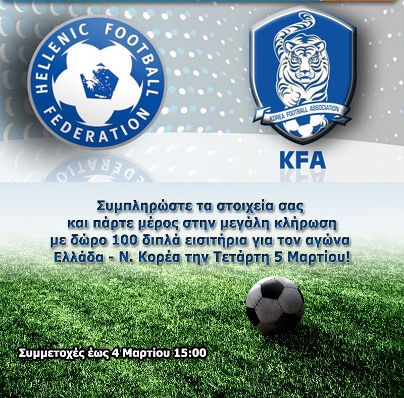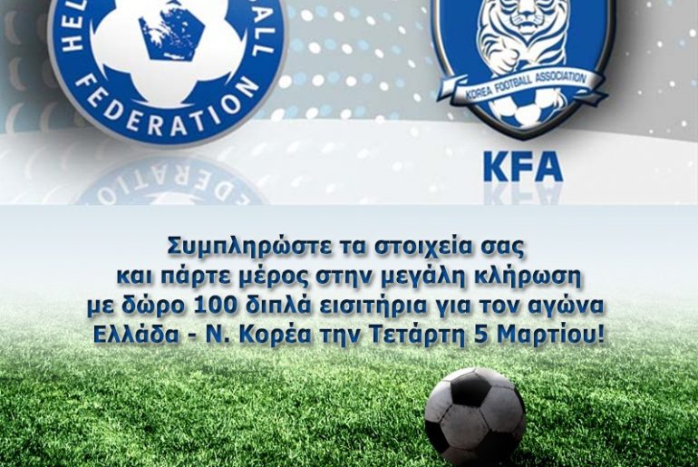 Η ΕΠΟ διοργανώνει διαγωνισμό και σας δίνει τη δυνατότητα να κερδίσετε 100 διπλά εισιτήρια για το φιλικό της Εθνικής μας με αντίπαλο την Ν. Κορέα την Τετάρτη 5 Μαρτίου στο Στ. Καραΐσκάκη!
