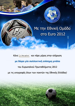 Η επίσημη σελίδα της ΕΠΟ στο facebook διοργανώνει διαγωνισμό και σας δίνει τη δυνατότητα να κερδίσετε μία συλλεκτική επίσημη μπάλα του Ευρωπαϊκού Πρωταθλήματος 2012 με τις υπογραφές όλων των παικτών της Εθνικής Ομάδας.
