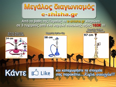 Το e-shisha.gr διοργανώνει διαγωνισμό και σας δίνει τη δυνατότητα να κερδίσετε 3 ναργιλέδες συνολικής αξίας 160€.