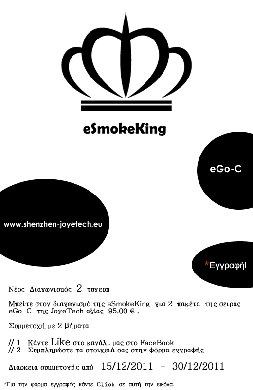Το esmokeking διοργανώνει διαγωνισμό στο facebook και σας δίνει τη δυνατότητα να κερδίσετε 2 πακέτα της σειράς eGo-C της JoyeTech αξίας 95.00 € .