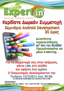 Το ExpertIN Θεσσαλονίκης διοργανώνει διαγωνισμό και σας δίνει τη δυνατότητα να κερδίσετε δωρεάν συμμετοχή στο σεμινάριο 30 ωρών Android Development (smartphones & tablets).