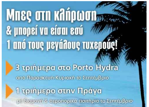 «Μπες στην κλήρωση & μπορεί να είσαι εσύ 1 από τους μεγάλους τυχερούς! Τρία 3 ημερα στο Porto Hydra από Παρασκευή-Κυριακή το Σεπτέμβριο & ένα 3ημερο στην Πράγα με διαμονή και αεροπορικά εισιτήρια το Σεπτέμβριο»