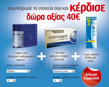 Το Fakoi-epafhs.gr διοργανώνει διαγωνισμό και σας δίνει τη δυνατότητα να κερδίσετε 1 rapid care (ηλεκτρικό καθαριστικό φακών), 2 φακούς επαφής Concept και ένα υγρό συντήρησης NovaSoft 60ml.