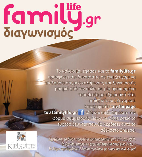Το καλοκαίρι έφτασε και το familylife.gr διοργανώνει διαγωνισμό και προσφέρει την δυνατότητα σε ένα ζευγάρι (μαζί με ένα μικρό παιδάκι έως 2 ετών) να απολαύσει στιγμές χαλάρωσης και ξεγνοιασιάς μακριά από την πόλη, σε μία προικισμένη τοποθεσία με εξαιρετική θέα, στους κήπους Ζαγοριού.