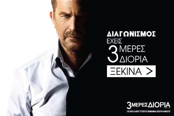 H Feelgood Entertainment διοργανώνει διαγωνισμό και σας δίνει τη δυνατότητα να κερδίσετε 10 διπλές προσκλήσεις για την πρεμιέρα της ταινίας του Kevin Costner, 3 Μέρες Διορία, τη Δευτέρα 7 Ιουλίου στις 21.00 στην Αίγλη Ζαππείου.