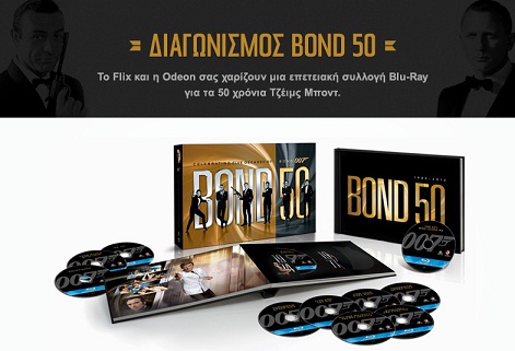 Το Flix.gr και η Odeon γιορτάζουν τα 50 χρόνια από την πρώτη κινηματογραφική περιπέτεια του πιο θρυλικού πράκτορα της μεγάλης οθόνης και σας χαρίζουν μια επετειακή συλλογή που περιλαμβάνει και τις 22 ταινίες του Τζέιμς Μποντ σε Blu-Ray και περισσότερες από 120 ώρες extra υλικού.