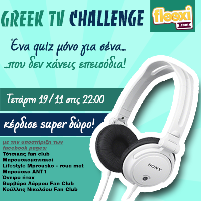 Παίξτε στο εβδομαδιαίο GREEK TV CHALLENGE που διοργανώνει το flooxi.com, απαντήστε σωστά σε περισσότερες ερωτήσεις από τους αντιπάλους σας με θέμα την ελληνική τηλεόραση και κερδίστε ένα φοβερό set ακουστικών Sony αξίας 20 ευρώ.
