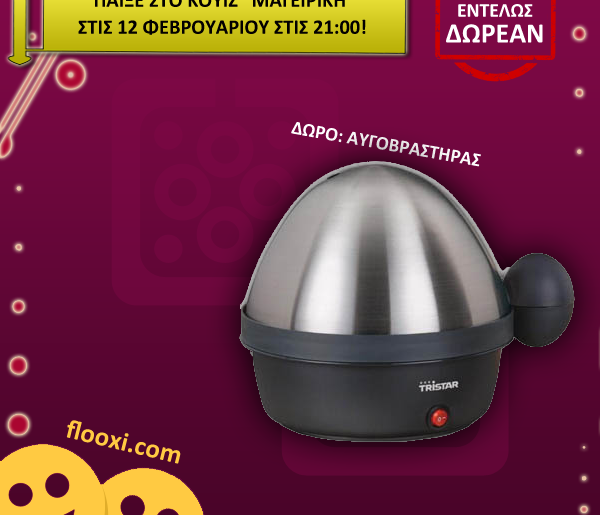 Εγγραφείτε στο δωρεάν κουίζ “Μαγειρική” του flooxi.com και παίξτε στις 12 Φεβρουαρίου στις 21:00 για να διεκδικήσετε έναν Αυγοβραστήρα Tristar!