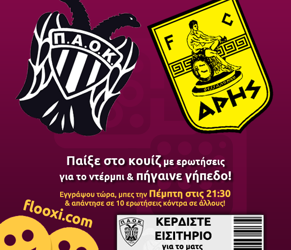 Εγγραφείτε τώρα στο δωρεάν κουίζ “ΠΑΟΚ-ΑΡΗΣ ποδόσφαιρο” του flooxi.com και παίξτε αύριο 21/11 στις 21:30 για να διεκδικήσετε ένα εισιτήριο για τον αγώνα ποδοσφαίρου της Κυριακής ΠΑΟΚ-ΑΡΗΣ!