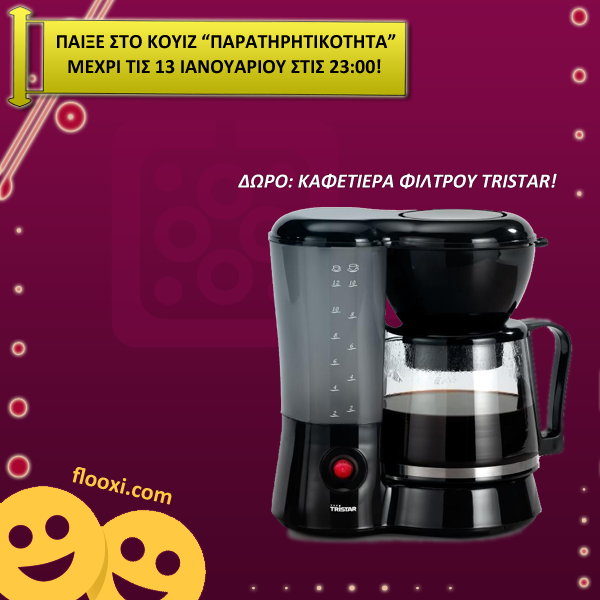Εγγραφείτε στο δωρεάν κουίζ “Παρατηρητικότητα” του flooxi.com και παίξτε μέχρι τις 13 Ιανουαρίου για να διεκδικήσετε μια καφετιέρα φίλτρου Tristar KZ-2211 1,2lt!