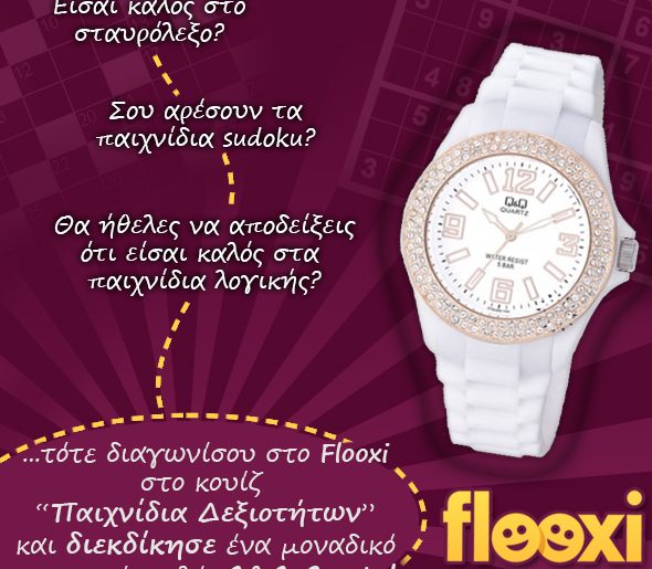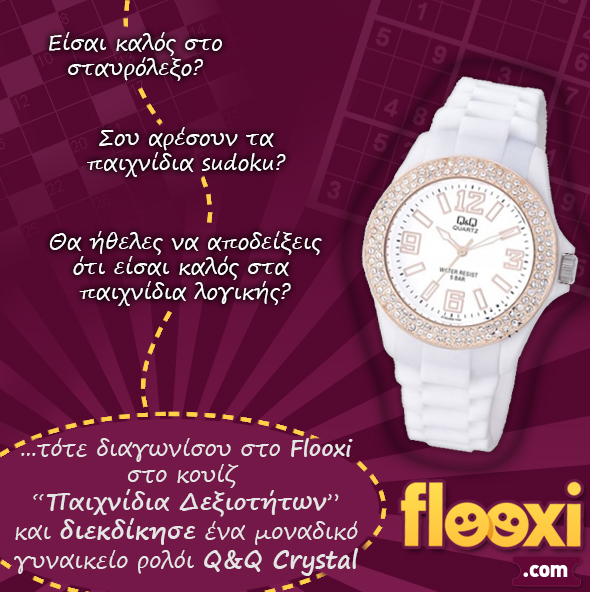 Το flooxi.com διοργανώνει διαγωνισμό και σας δίνει τη δυνατότητα να κερδίσετε ένα πανέμορφο γυναικείο ρολόι Q&Q Crystal Ladies από ροζ επιχρυσωμένο μεταλλικό με κρύσταλλα, λευκό κεραμικό και λευκό καουτσούκ λουράκι.