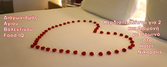 Λάβε μέρος στο νέο διαγωνισμό για ερωτευμένους του Food IQ και κέρδισε ένα πακέτο Αγ. Βαλεντίνου για ένα ζευγάρι στο Hotel Nikopolis με δείπνο, διαμονή, πρωινό και χρήση spa στις 14 Φεβρουαρίου.