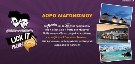 Τα Fonzies και το MAD σε προσκαλούν στο πιο hot Lick It Party στη Μύκονο! Παίξε το παιχνίδι και μπορεί να κερδίσεις ένα από τα 3 ταξίδια για 2 άτομα στη Μύκονο, στις 26 Ιουλίου, με διαμονή και μεταφορά δώρο από τα Fonzies.