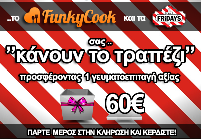 Τα TGI Fridays σε συνεργασία με το FunkyCook.gr, “κάνουν το τραπέζι” σε έναν τυχερό με ελεύθερη επιλογή από το μενού. Μπείτε στην κλήρωση και κερδίστε μια δωροεπιταγή γεύματος αξίας 60€.
