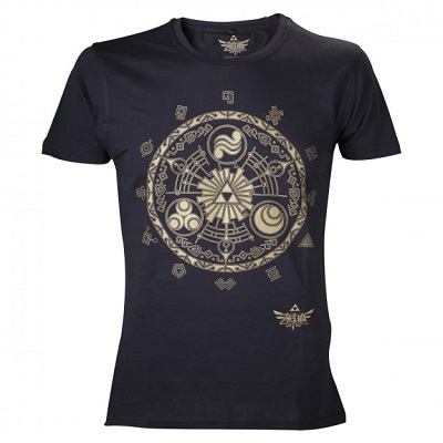 Eμβληματικό μαύρο μπλουζάκι, 100% από βαμβάκι, με ένα εκπληκτικό κυκλικό σχέδιο στο στήθος. Το συγκεκριμένο σχέδιο είναι η αποθέωση των συμβόλων αφού είναι γεμάτο με εμβλήματα: στο κέντρο έχουμε φυσικά το Triforce.