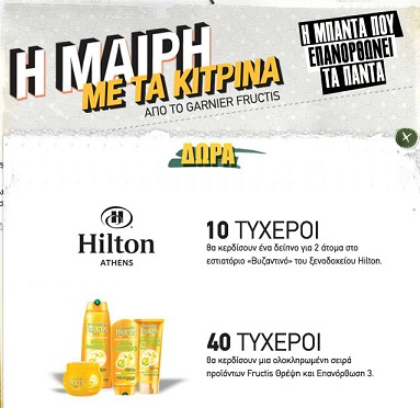 Η σελίδα Garnier Greece διοργανώνει διαγωνισμό και σας δίνει τη δυνατότητα να κερδίσετε 10 γεύματα στο εστιατόριο Βυζαντινό στο ξενοδοχείο Hilton και 40 σετ (σαμπουάν, κρέμα μαλλιών, περιποίηση στη στιγμή, μάσκα μαλλιών) της σειράς Fructis ΘΡΕΨΗ ΚΑΙ ΕΠΑΝΟΡΘΩΣΗ 3.