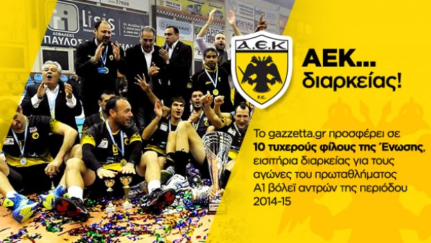 Το gazzetta σε συνεργασία με το ΤΑΑ ΑΕΚ προσφέρουν σε δέκα τυχερούς από ένα εισιτήριο διαρκείας για την αγωνιστική σεζόν 2014-15 στην Α1 βόλεϊ ανδρών!
