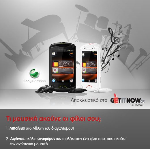 Τί μουσική ακούνε οι φίλοι σου; Κάνε Like τη σελίδα του Getitnow.gr στο facebook, μπες στο μουσικό Album και ανάφερέ τους στην αντίστοιχη φωτό! Έτσι συμμετέχεις αυτόματα στο Διαγωνισμό με δώρο 2 μοναδικά Sony Ericsson Live with Walkman.