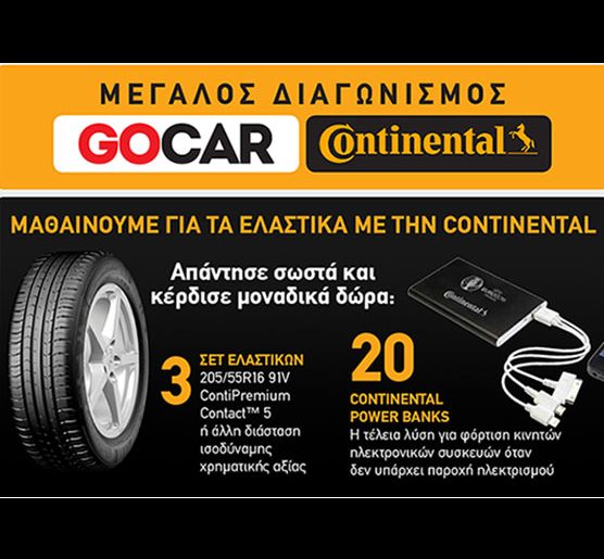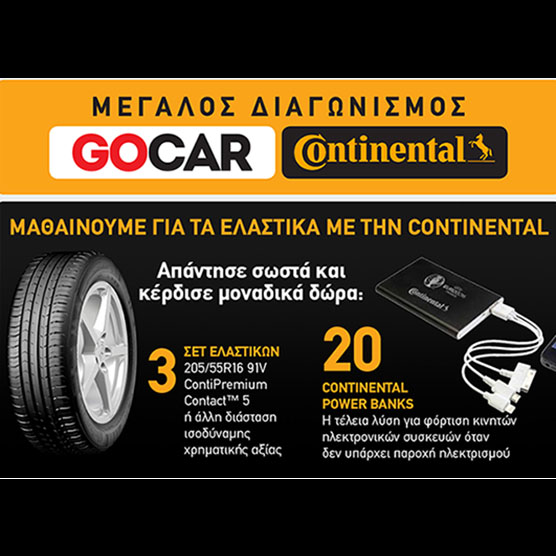 Το gocar.gr διοργανώνει διαγωνισμό και σας δίνει τη δυνατότητα να κερδίσετε 3 σετ ελαστικών 205/55R16 91V ContiPremiumContact™ 5 ή άλλη διάσταση ισοδύναμης χρηματικής αξίας και 20 Continental power banks, την τέλεια λύση για φόρτιση κινητών ηλεκτρονικών συσκευών όταν δεν υπάρχει παροχή ηλεκτρισμού!