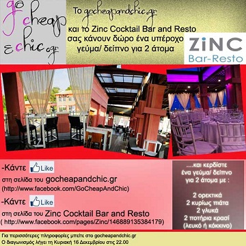 Το gocheapandchic.gr διοργανώνει διαγωνισμό και σας δίνει τη δυνατότητα να κερδίσετε ένα γεύμα/ δείπνο για 2 άτομα στο Zinc.