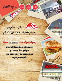 Η σελίδα Goody’s στο facebook διοργανώνει διαγωνισμό και σας δίνει τη δυνατότητα να κερδίσετε ένα γεύμα αξίας 40 ευρώ.