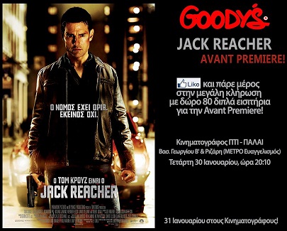 Τα Goody’s διοργανώνουν διαγωνισμό και σας δίνουν τη δυνατότητα να κερδίσετε 80 διπλές προσκλήσεις για την  Avant Premiere της ταινίας JACK REACHER που θα πραγματοποιηθεί στον Κινηματογράφο «ΠΤΙ-ΠΑΛΑΙ» την Τετάρτη 30 Ιανουαρίου 2013 στις 8:10 το βράδυ.