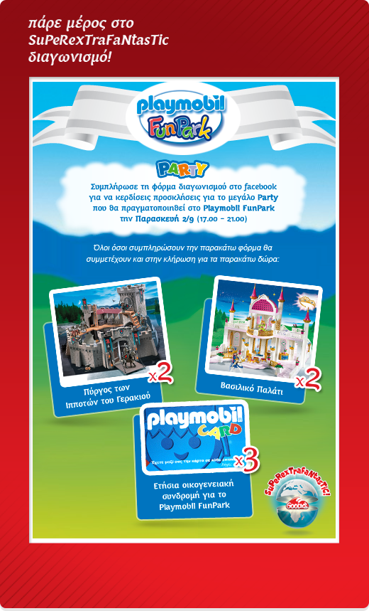 Tα Goody’s διοργανώνουν διαγωνισμό στο facebook και σας δίνουν τη δυνατότητα να κερδίσετε προσκλήσεις για το μεγάλο Party που θα πραγματοποιηθεί στο Playmobil Fun Park την Παρασκευή 2 Σεπτεμβρίου και ώρα 17:00