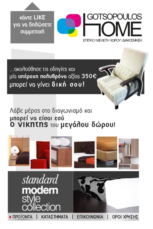 Τα έπιπλα Gotsopoulos HOME διοργανώνουν διαγωνισμό για να γιορτάσουν την νέα τους ιστοσελίδα και χαρίζουν σε έναν τυχερό μια πανέμορφη πολυθρόνα αξίας 350 ευρώ.