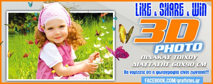 Η σελίδα Grafistes διοργανώνει διαγωνισμό και σας δίνει τη δυνατότητα να κερδίσετε ένα μοναδικό πίνακα με τη φωτογραφία σας τρισδιάστατη (εφέ 3D), διαστάσεων 60 Χ 90εκ!