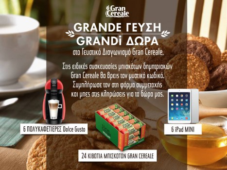 Η σελίδα Grancereale Greece διοργανώνει διαγωνισμό και δίνει τη δυνατότητα σε 1 τυχερό κάθε εβδομάδα να κερδίσει ένα κιβώτιο μπισκότων Gran Cereale, σε 1 τυχερός κάθε 15 του μήνα να κερδίσει μια πολυκαφετιέρα Nescafe Dolce Gusto και σε 1 τυχερό στο τέλος κάθε μήνα ένα Apple iPad Mini Wifi 16GB.