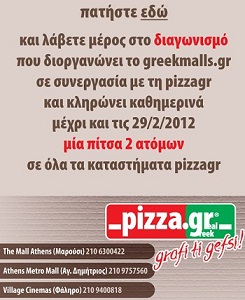 Το greekmalls.gr διοργανώνει διαγωνισμό και σας δίνει τη δυνατότητα να κερδίσετε μια πίτσα για 2 άτομα στα καταστήματα pizza.gr καθημερινά.